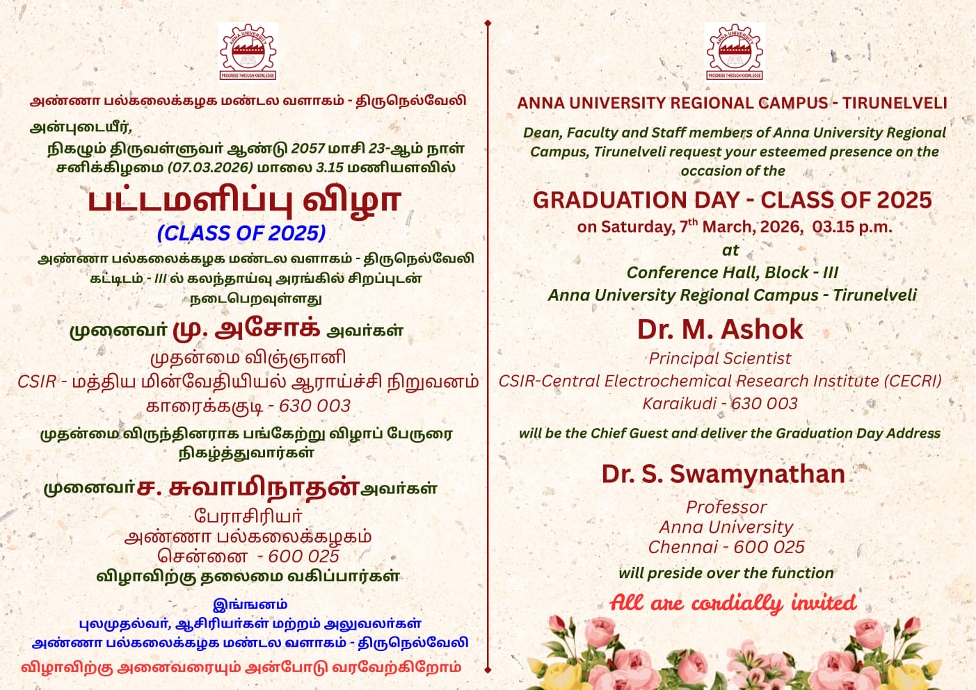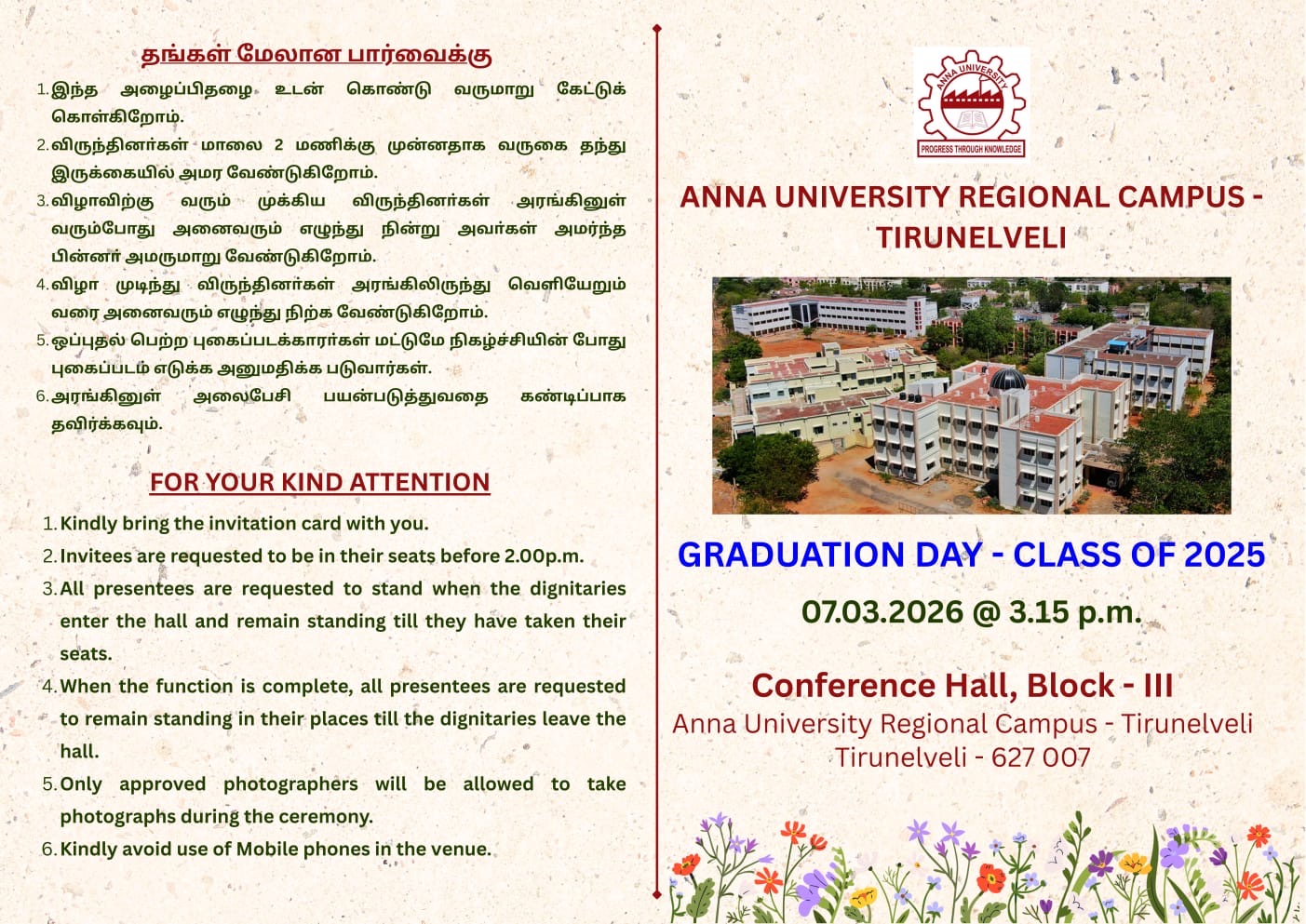 You are warmly invited to witness the Graduation Ceremony of Anna University Regional Campus Tirunelveli. Join the celebration of academic excellence and achievements through the official live broadcast.
